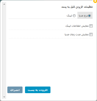 نکته: گزینه های "نمایش عنوان" "نمایش حجم" و "نمایش توضیحات" که تحت زبانه "لینک" وجود دارند ارتباطی به پخش فایل در مطلب ندارند و در هر دو حالت درج مدیا و درج لینک قابل تنظیم خواهند بود.